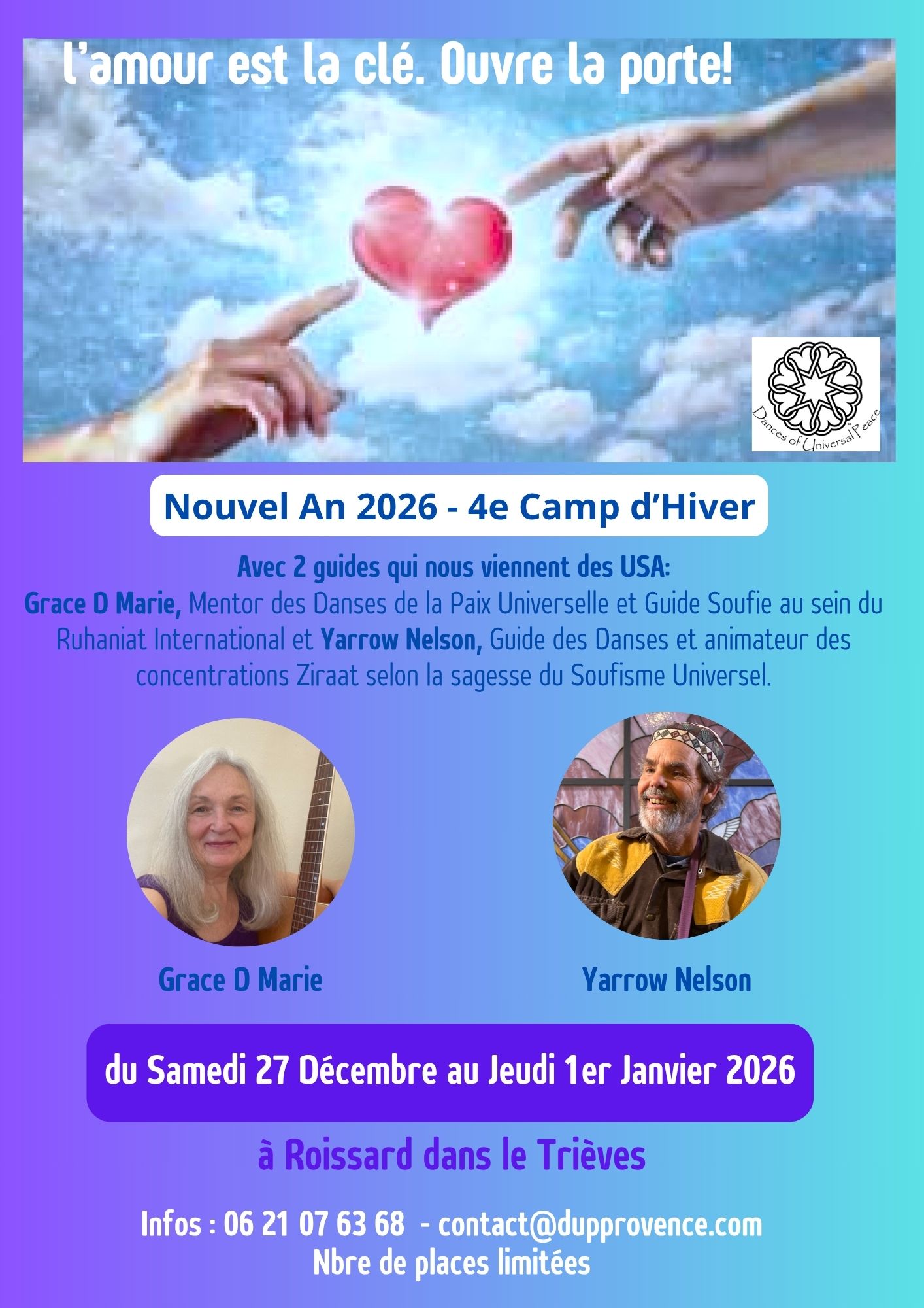 C’est aussi l’occasion pour la famille française des Danses de la Paix Universelle de se retrouver et de vivre ensemble ce passage dans la joie, l’amour, le partage. Cette fois-ci, c’est Grace D Marie et Yarrow Nelson qui nous enchanteront. Ils viennent tous deux des Etats-Unis et sont engagés sur le chemin des Danses de la Paix Universelle depuis de nombreuses années en tant que guides, mentors et organisateurs de Camps ou retraites des Danses.
