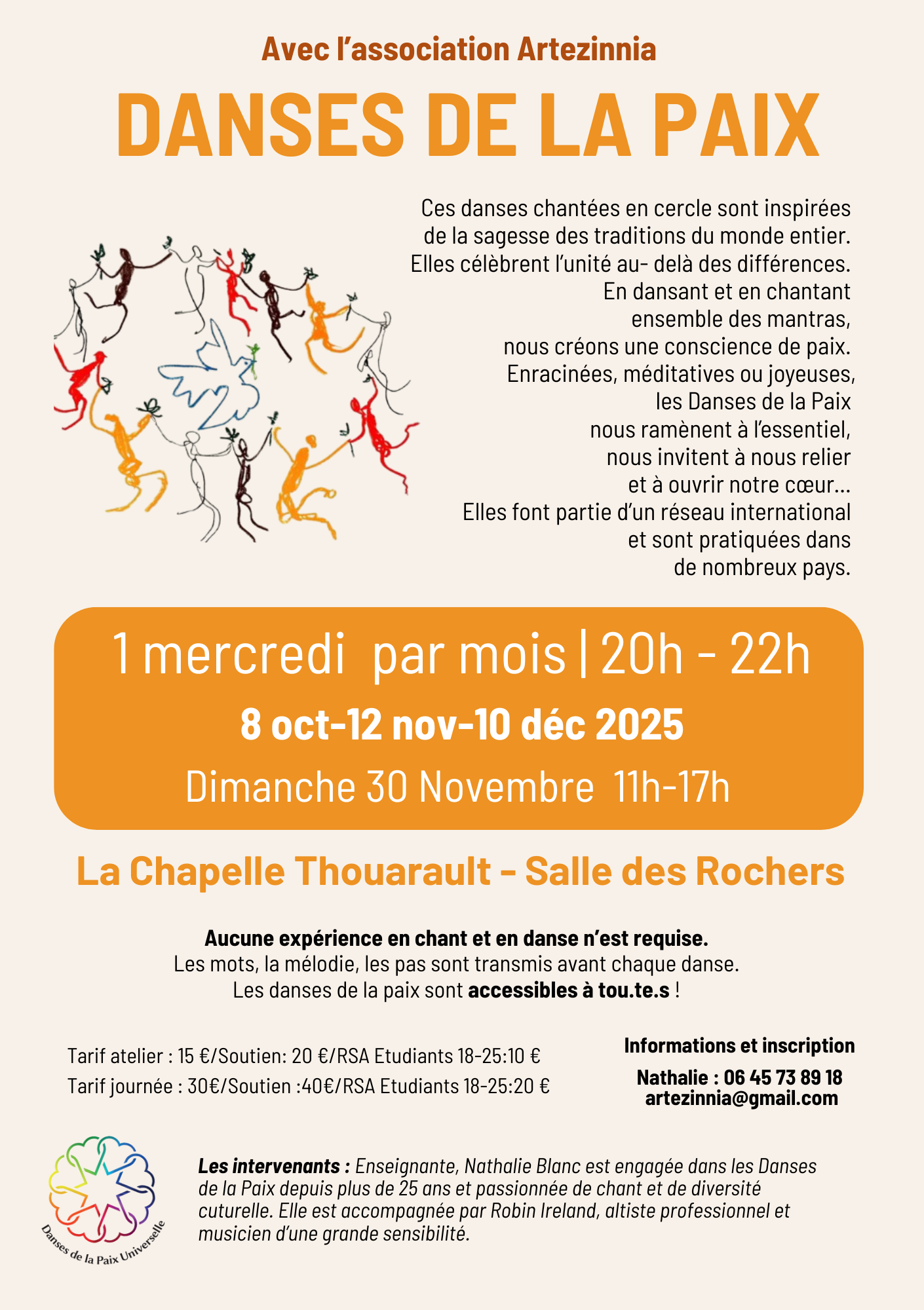 Nathalie, mentore de Danses de la paix , transmet chaque danse avec enthousiasme et douceur et Robin, musicien professionnel l’accompagne à l’alto ou autres instruments pour soutenir et inspirer les danseurs/danseuses.