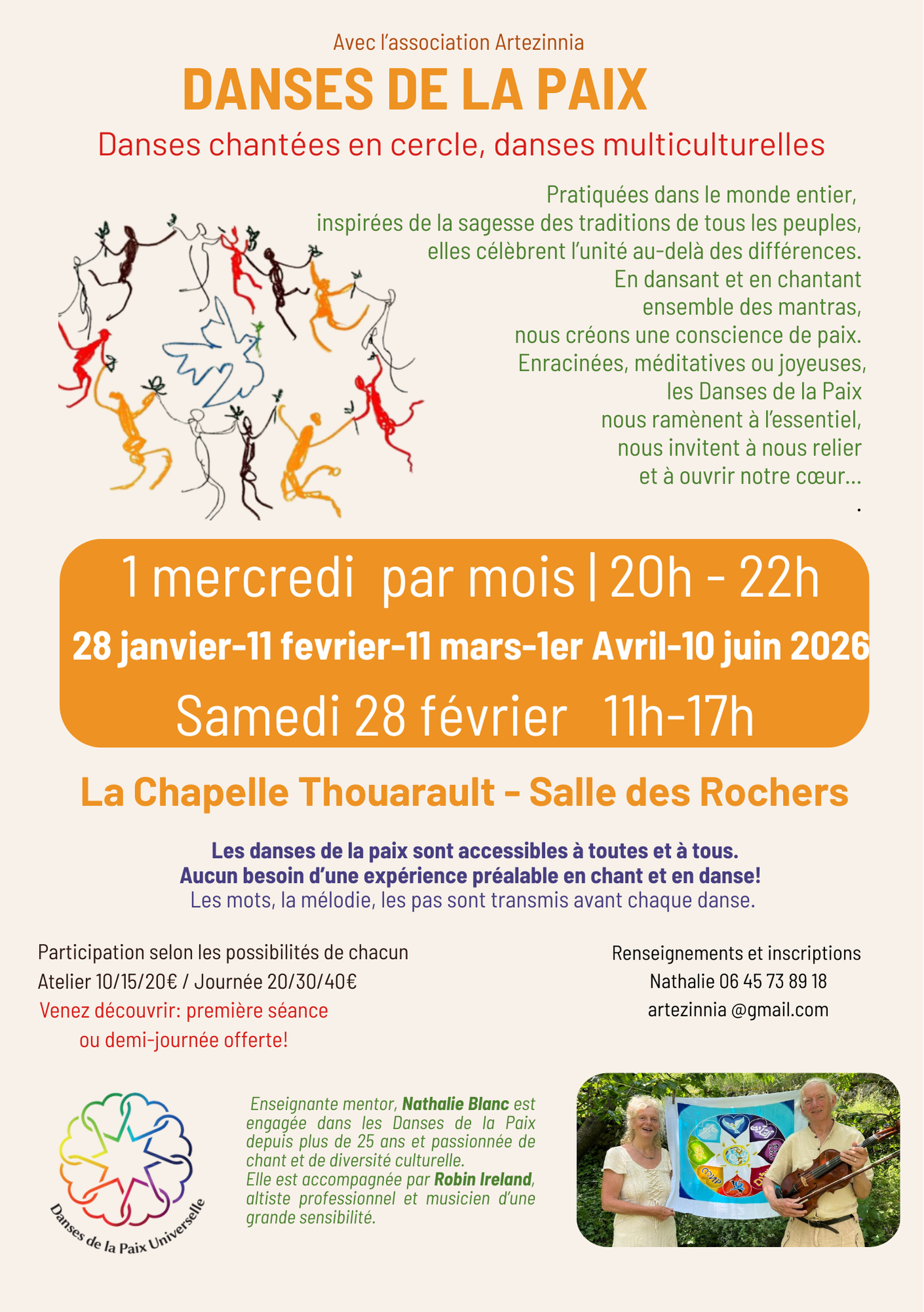 Nathalie transmet chaque danse avec enthousiasme et douceur et Robin l’accompagne en musique à l’alto ou autres instruments