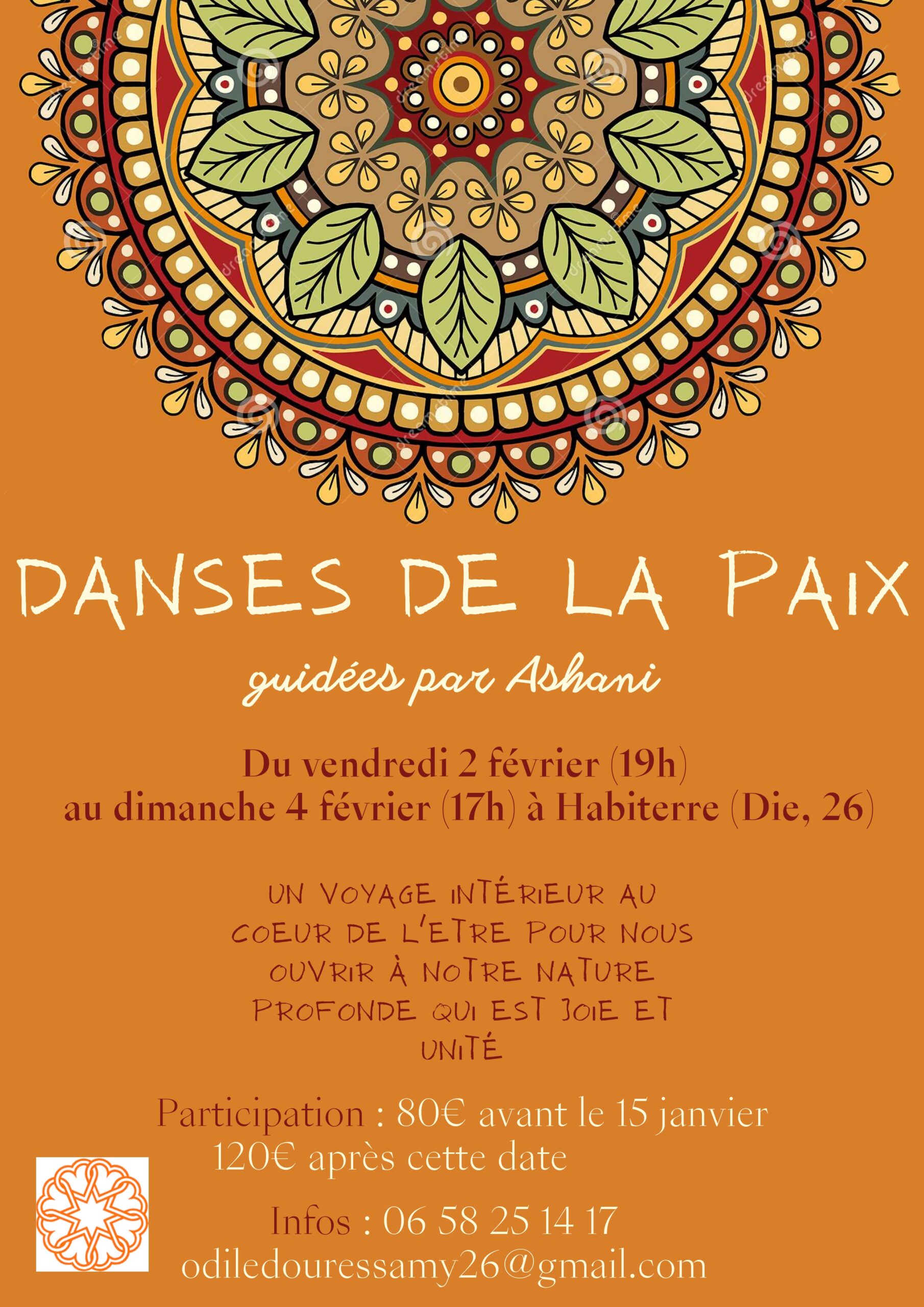 ← Retour au calendrier Danses de la Paix Universelle – Die (26150) Ashani, Sumitra (Guides des Danses), Majena (Percus) 02.02 – 04.02.24 Venez découvrir ces danses qui nous font tant de bien! Site web national : https://dansesdelapaixuniverselle.fr/ vidéos: