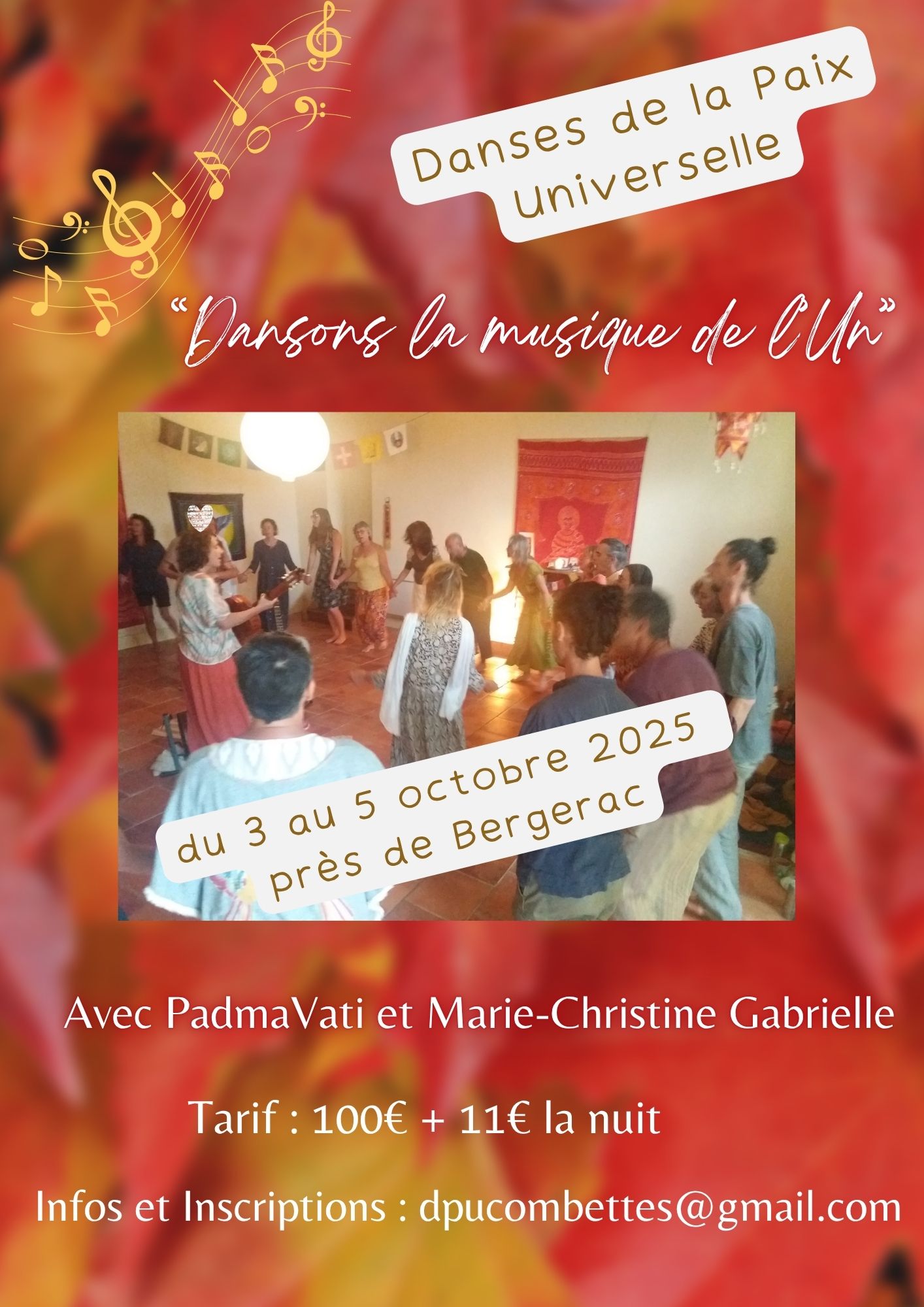 Ce sera notre dernier week end aux Combettes, la danse de l’Univers emmenant Yves-Mathieu vers d’autres aventures…Nous célébrerons ces cinq années d’une belle alchimie de Danses entre Padma, Marie-Christine, Yves-Mathieu, Stéphane, les Combettes… sans oublier les musiciens, Fabien, Solène, Shams, Lisa, Olivier, et l’aide discrète et si précieuse de Fernand, Christian, Jérôme, Emilie, et vous tous et toutes, danseurs et danseuses, fidèles depuis le 1er jour…
