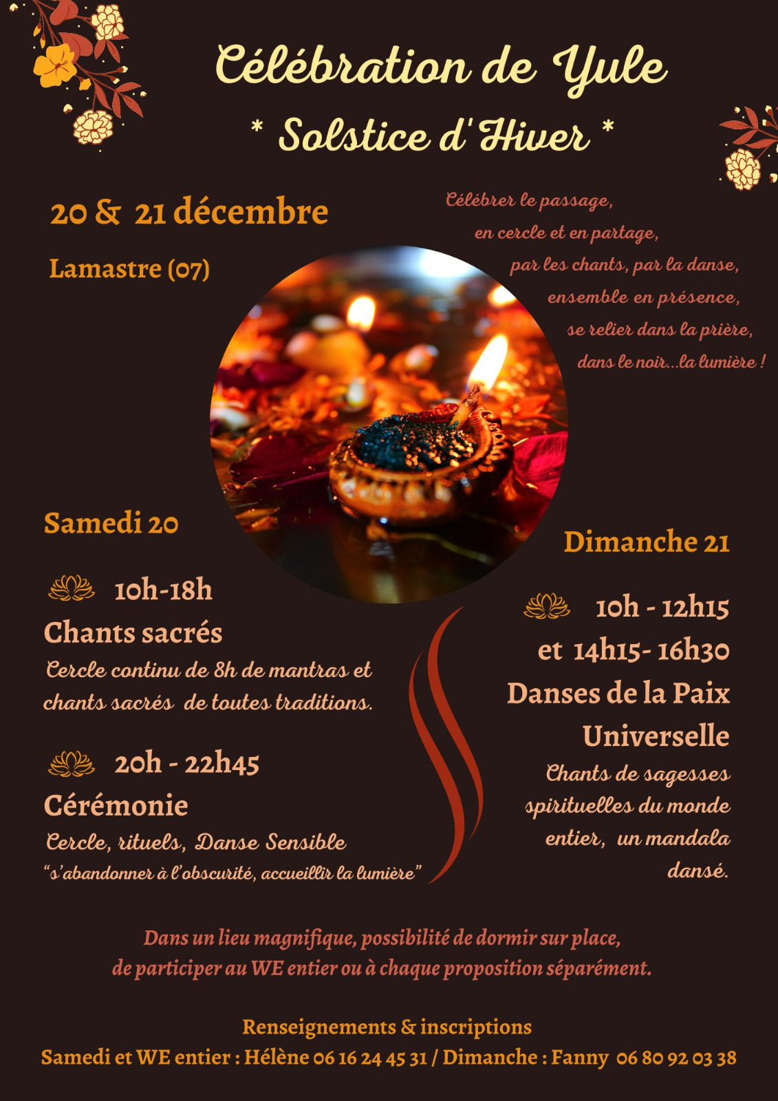 Cette journée du 21 décembre sera incluse à un weekend complet de Célébration du Solstice, Chants, Danses, et rituels, organisé par Hélène. Bienvenue sur tout ou partie de ces magnifiques propositions.