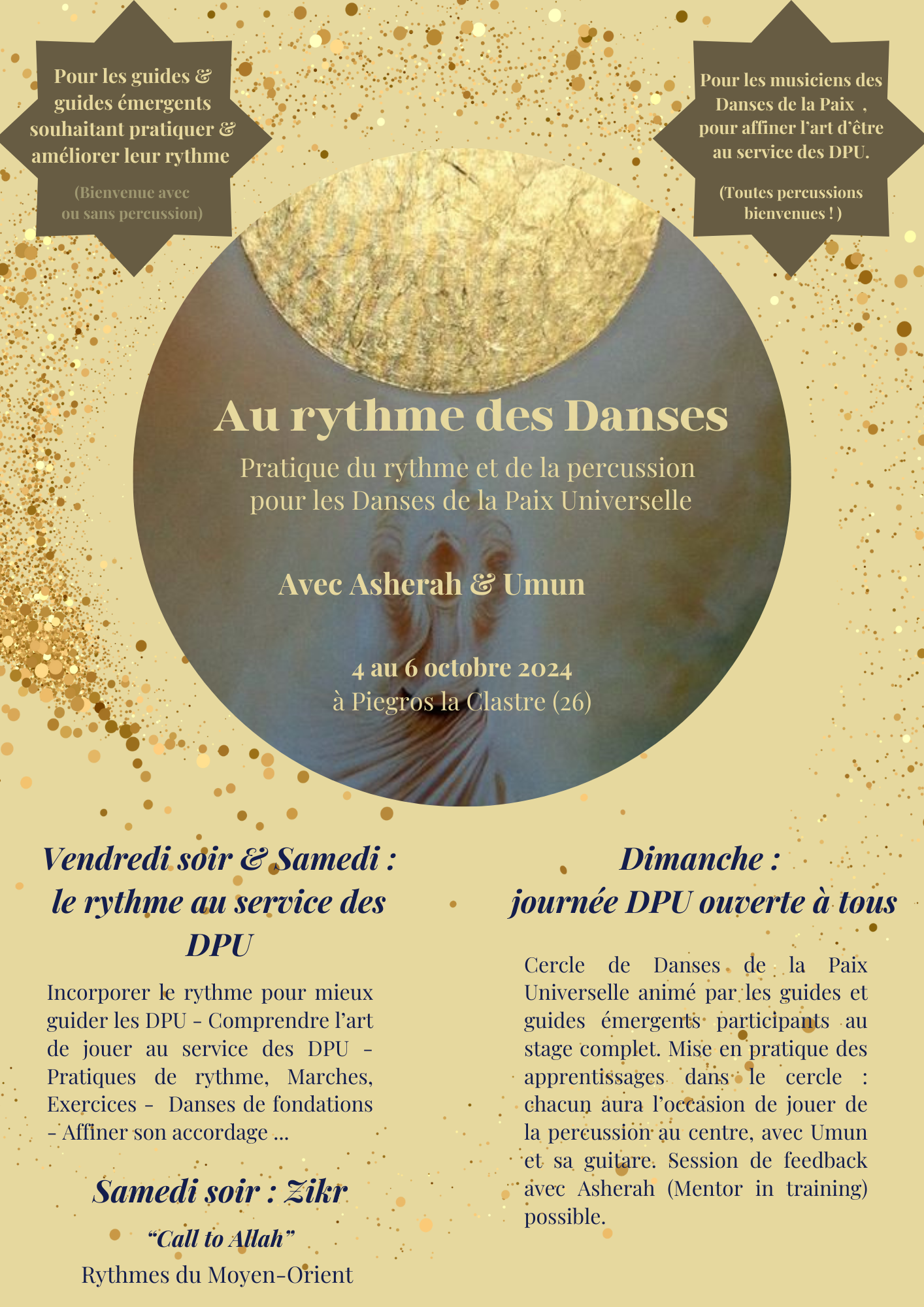 – Le focus du stage est le rythme au service des DPU : nous utiliserons des pratiques rythmiques bien évidemment, mais aussi les marches, la respiration, des exercices d’écoute sensible, d’harmonisation pour comprendre dans nos corps l’importance du rythme dans les danses de la paix universelle, tant pour le guide que pour le musicien. Nous explorerons également l’accordage à travers nos instruments et nos sensations/émotions, pour nous mettre pleinement au service des DPU.