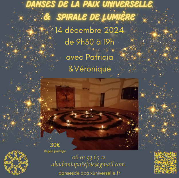 Patricia, vous fera voyager à travers les danses pour célébrer et rayonner la lumière en nos cœurs et au delà ! Quelques guides émergentes présentes proposeront quelques danses. Véronique animera la spirale de lumière.