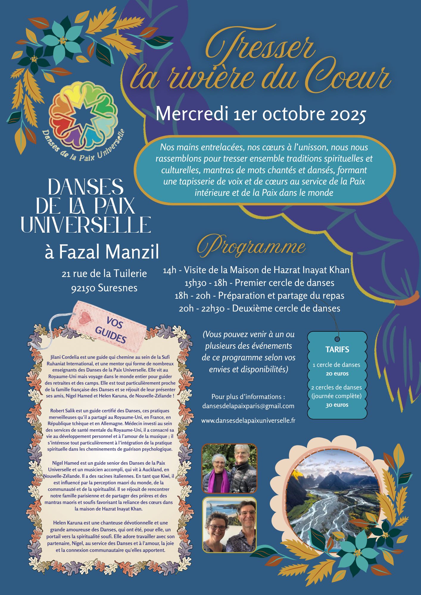 Nous (Gabrielle et Julien du Cercle de Paris) auront la joie de vous accueillir à Fazal Manzil (Suresnes) pour un très bel événement, le mercredi 1er octobre 2025 : deux sessions de danses (l’après-midi et le soir) guidées par Jilani Cordelia, Robert Salik (Angleterre), Nigel Hamed et Helen Karuna (Nouvelle-Zélande).