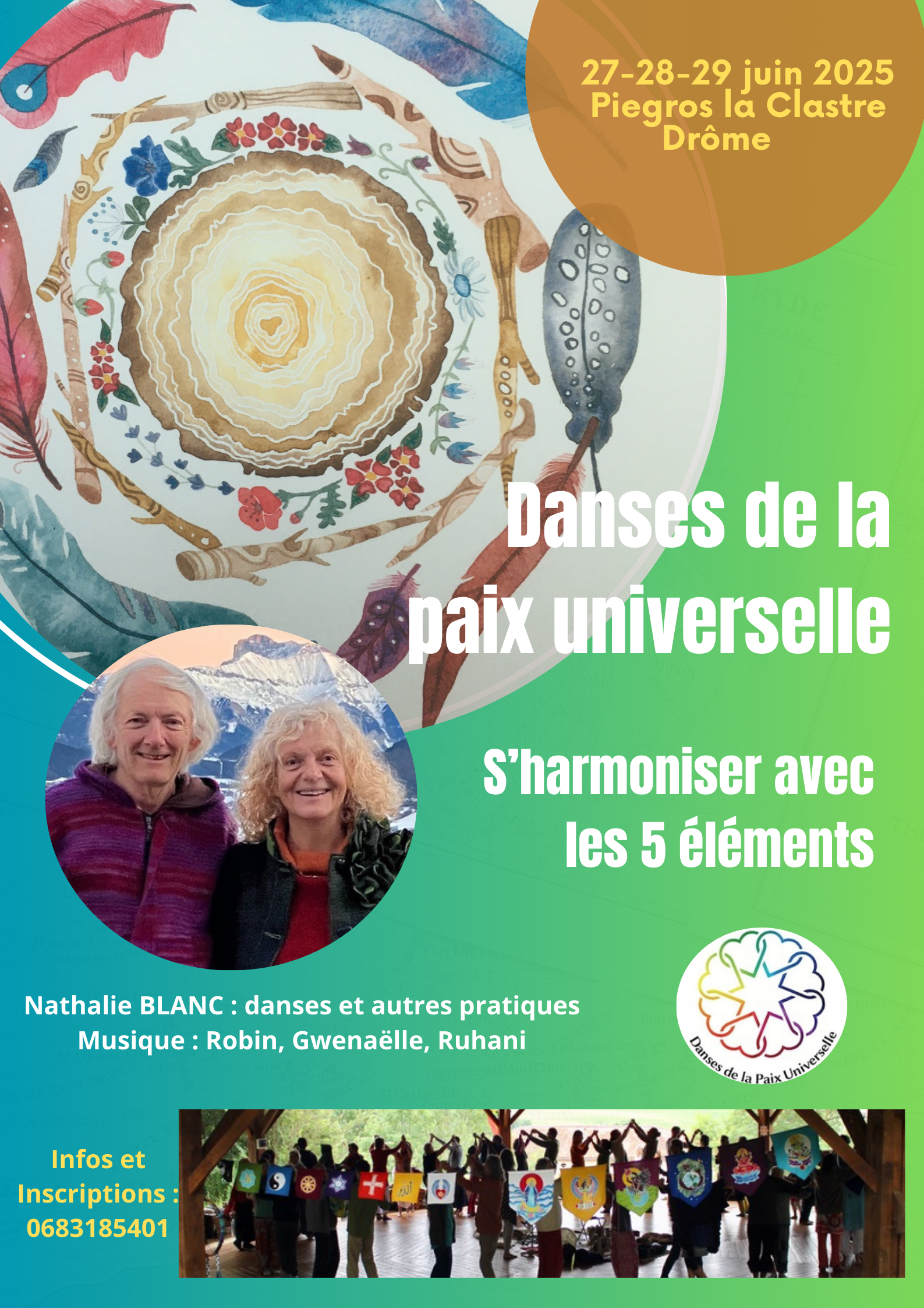 En ce temps de solstice, nous relier à la nature et explorer les qualités des éléments essentiellement à travers les danses de la paix universelle mais aussi des méditations, des respirations, des marches et une sortie à la rivière si le soleil est de la partie.