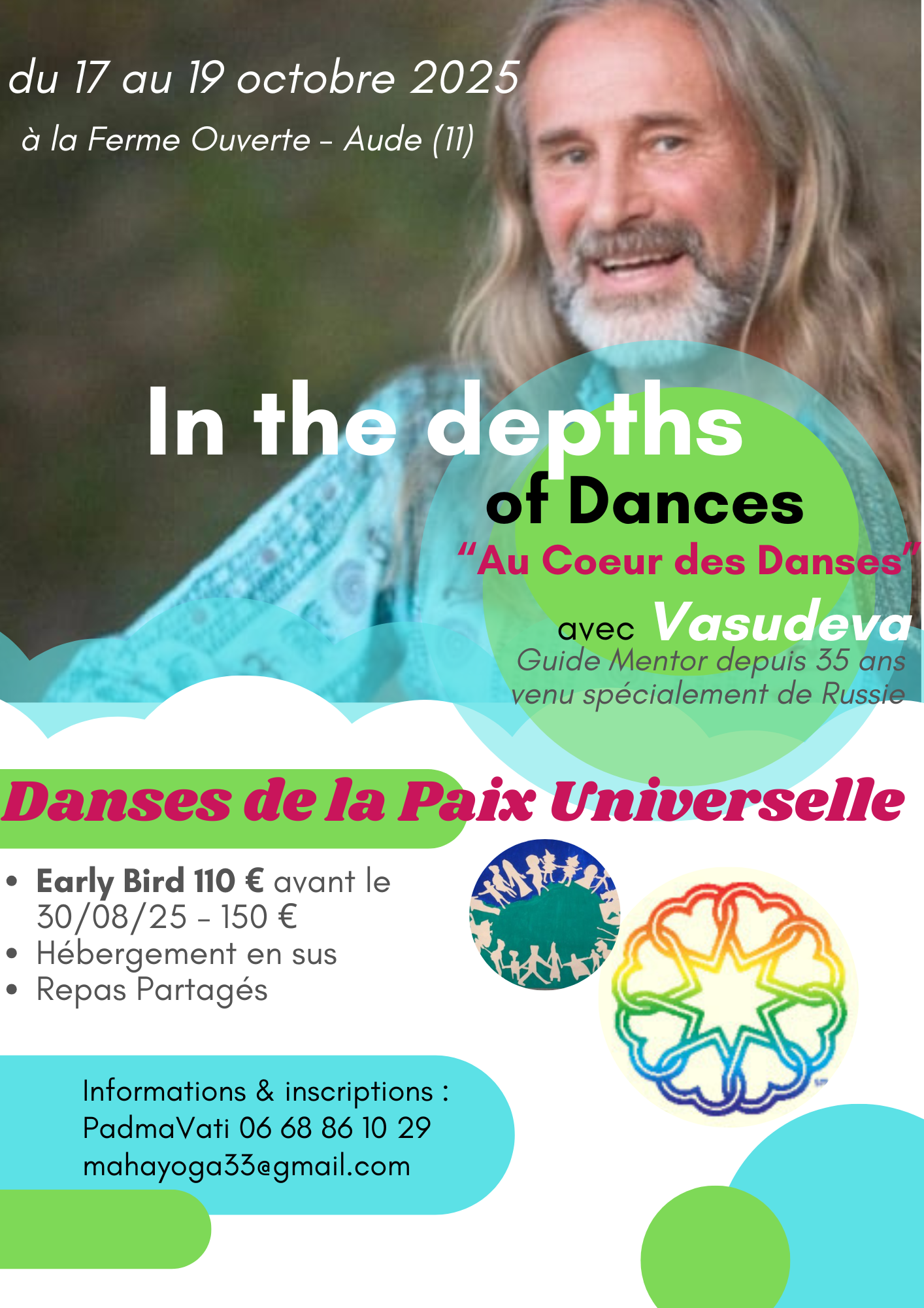 Vasudeva (de Russie) guide et mentor depuis 35 ans, revient en France à l’automne prochain nous partager son énergie incroyable et nous transmettre ses nombreuses danses de tradition hindoue.